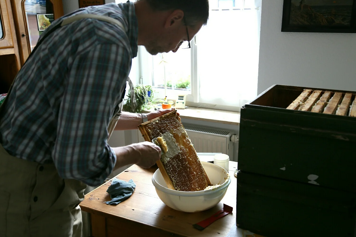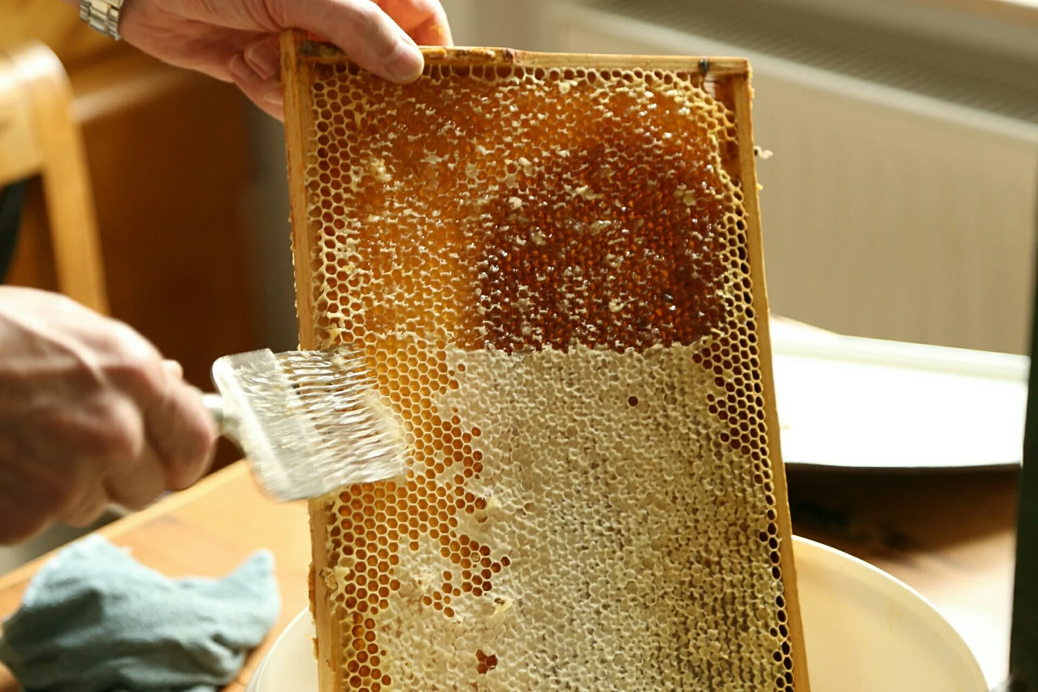 The trays have cells of honey on either side. Carefully using a comb-like device you have to scrape the tops off each side. The tops are sealed with a wax that is different to other parts of the honey comb.