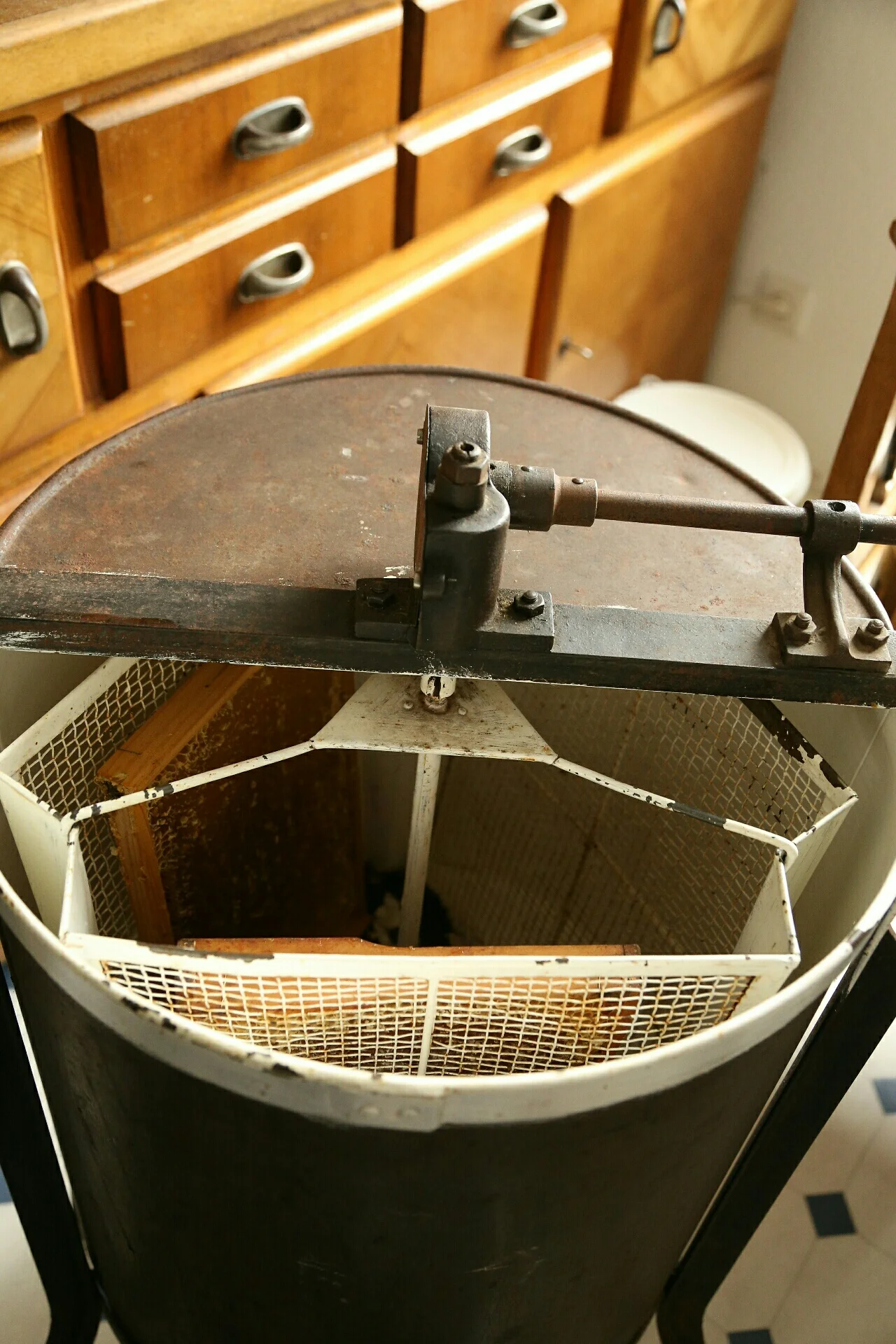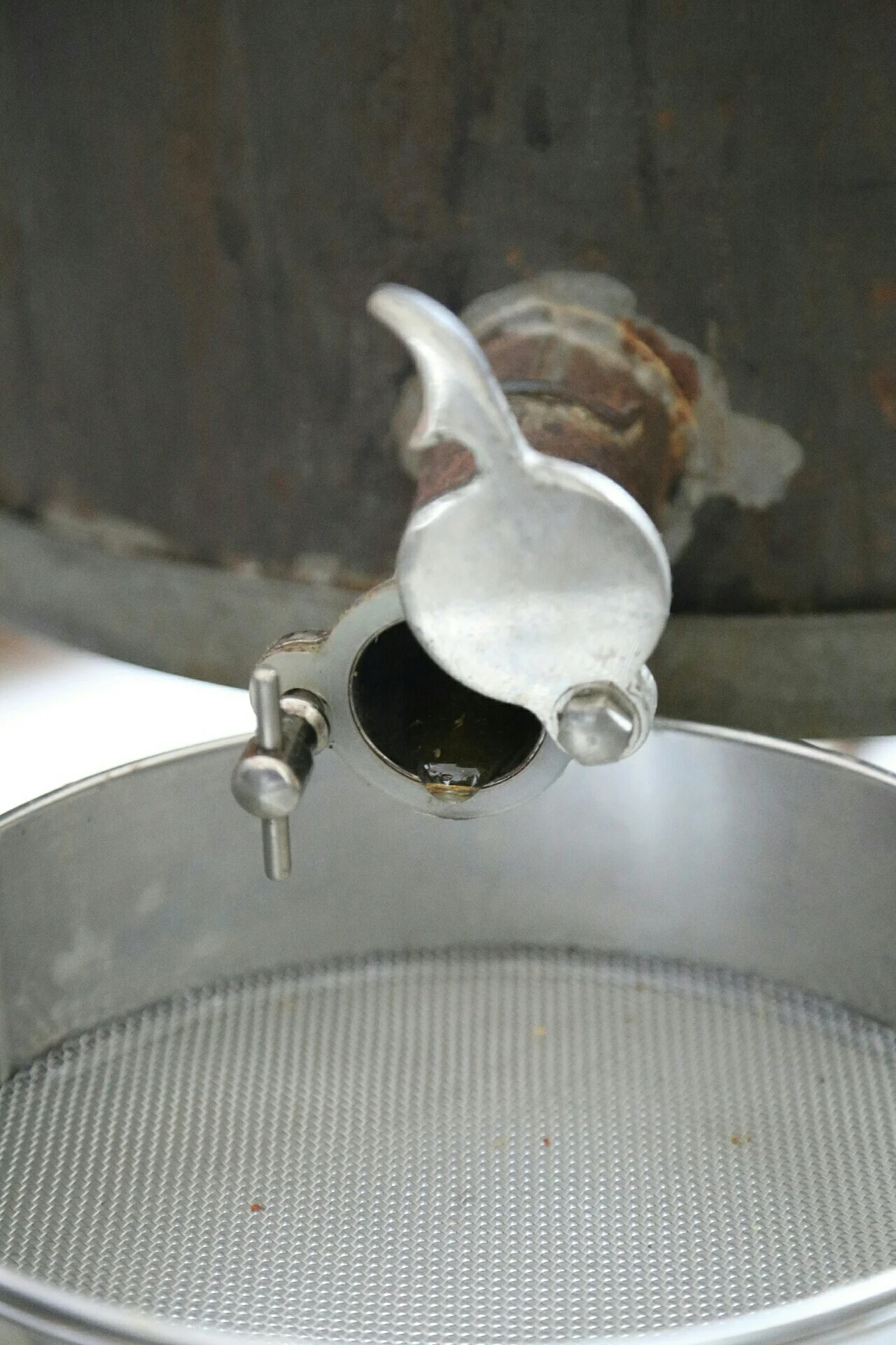 Honey collecting at the bottom of the drum.